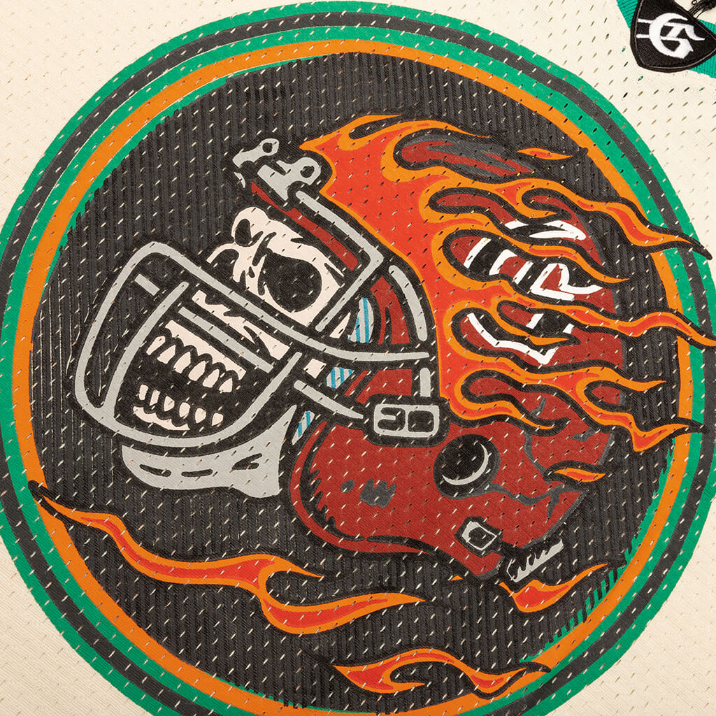 The First Down Jersey merges athletic-inspired elements with signature Godspeed edge. Crafted from cotton with a boxy fit, it features a ribbed V-neck with a logo patch for comfort and structure. Adorned in screen-printed graphics that merge sportswear and Godspeed heritage. Finished with a woven label above the hem for authenticity.