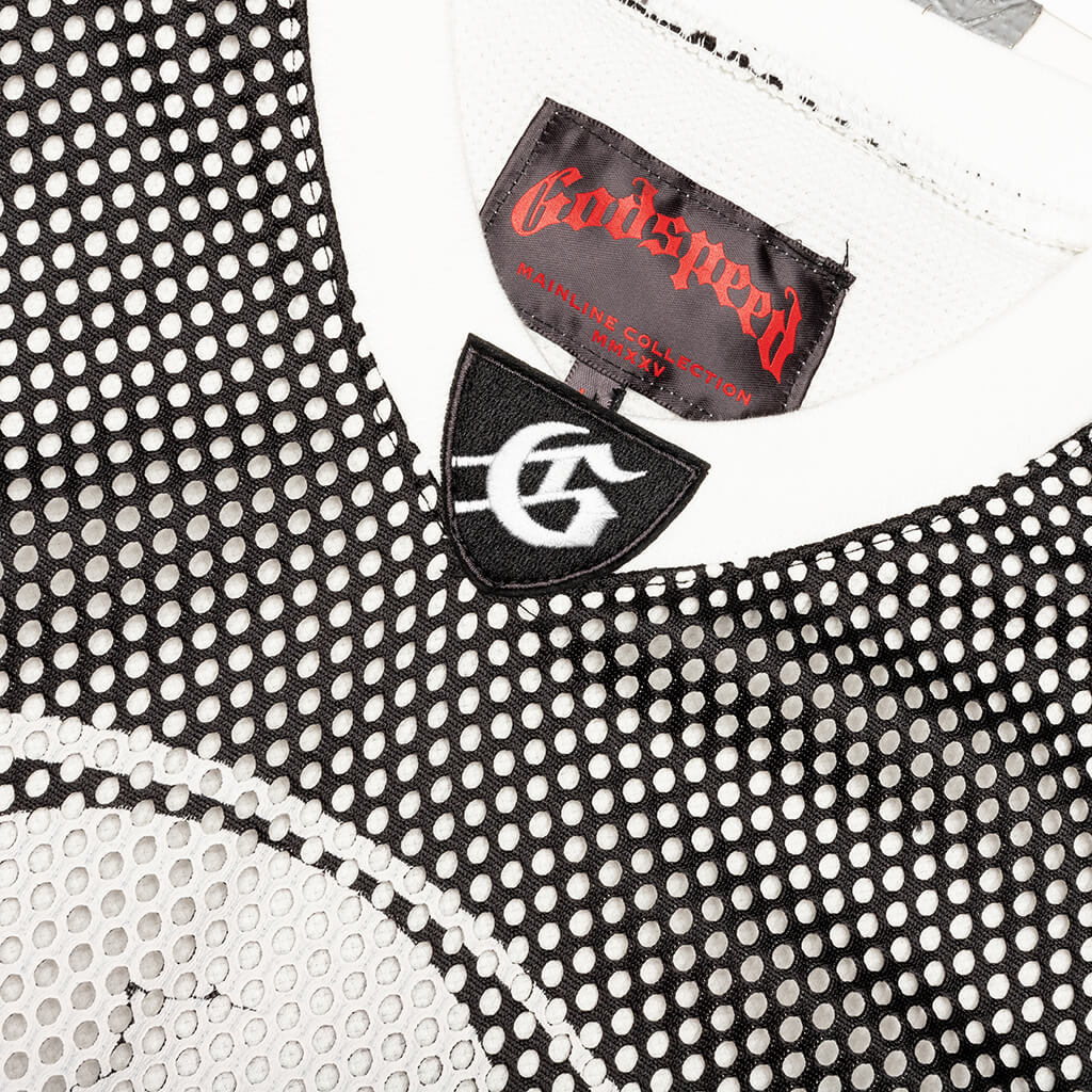 The TD Layered Jersey merges athletic-inspired elements with signature Godspeed edge. Crafted from cotton with an oversized fit, this piece features a mesh jersey with thermal sleeves. The ribbed V-neck, logo patch, and screen-printed graphics is a nod to sportswear heritage. Finished with a woven label above the hem for authenticity.