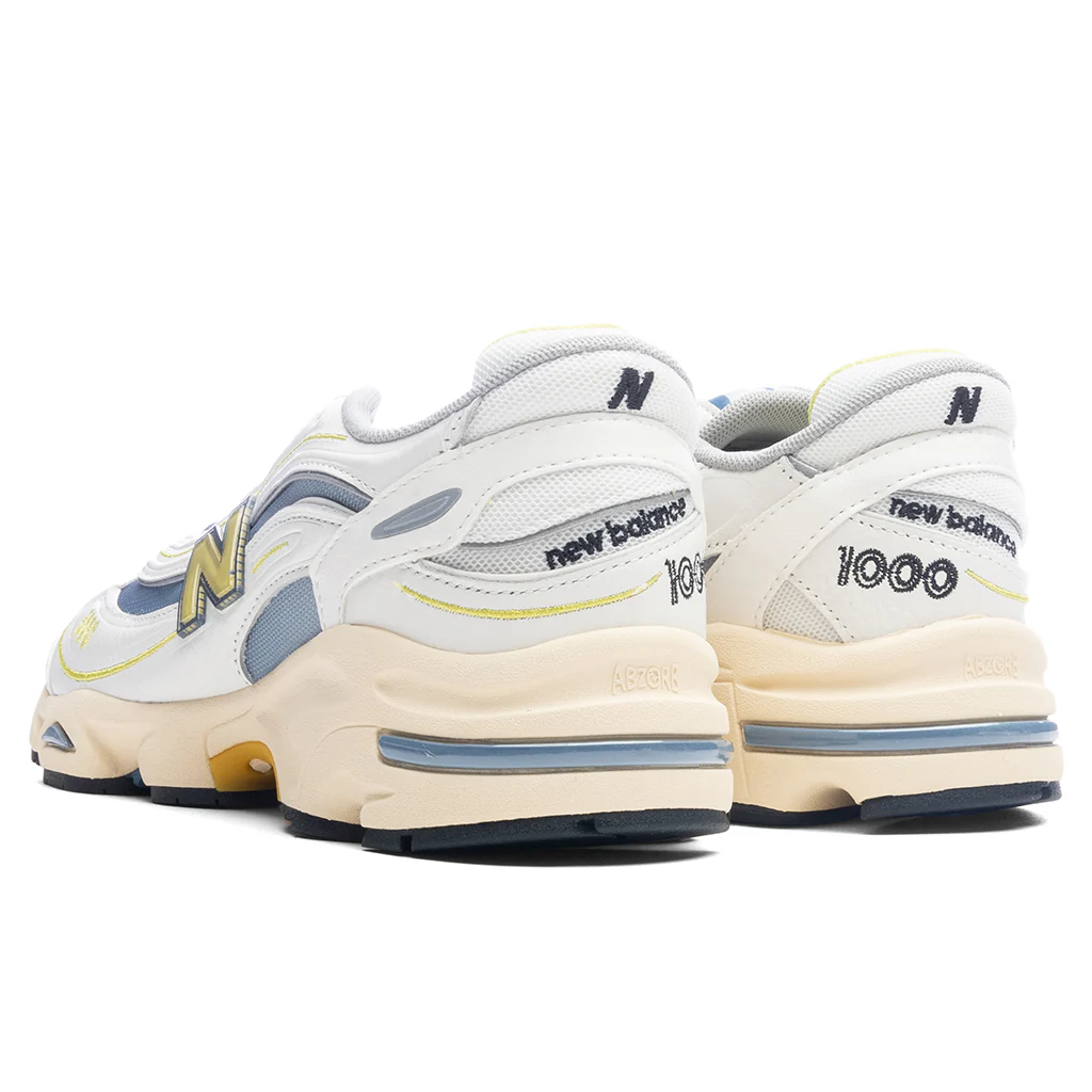 The New Balance 1000 in Sea Salt/Heron Blue brings a stylish edge to your footwear collection. The combination of breathable mesh underlays and durable synthetic overlays creates a dynamic, textured appearance. The sculpted midsole details and embroidered accents enhance the shoe's appeal, while the Stability Web adds a unique visual element. Reflective accents provide a sleek, modern look, and the rubberized 'N' logo with a transparent outline adds a bold, contemporary finish to this design.
