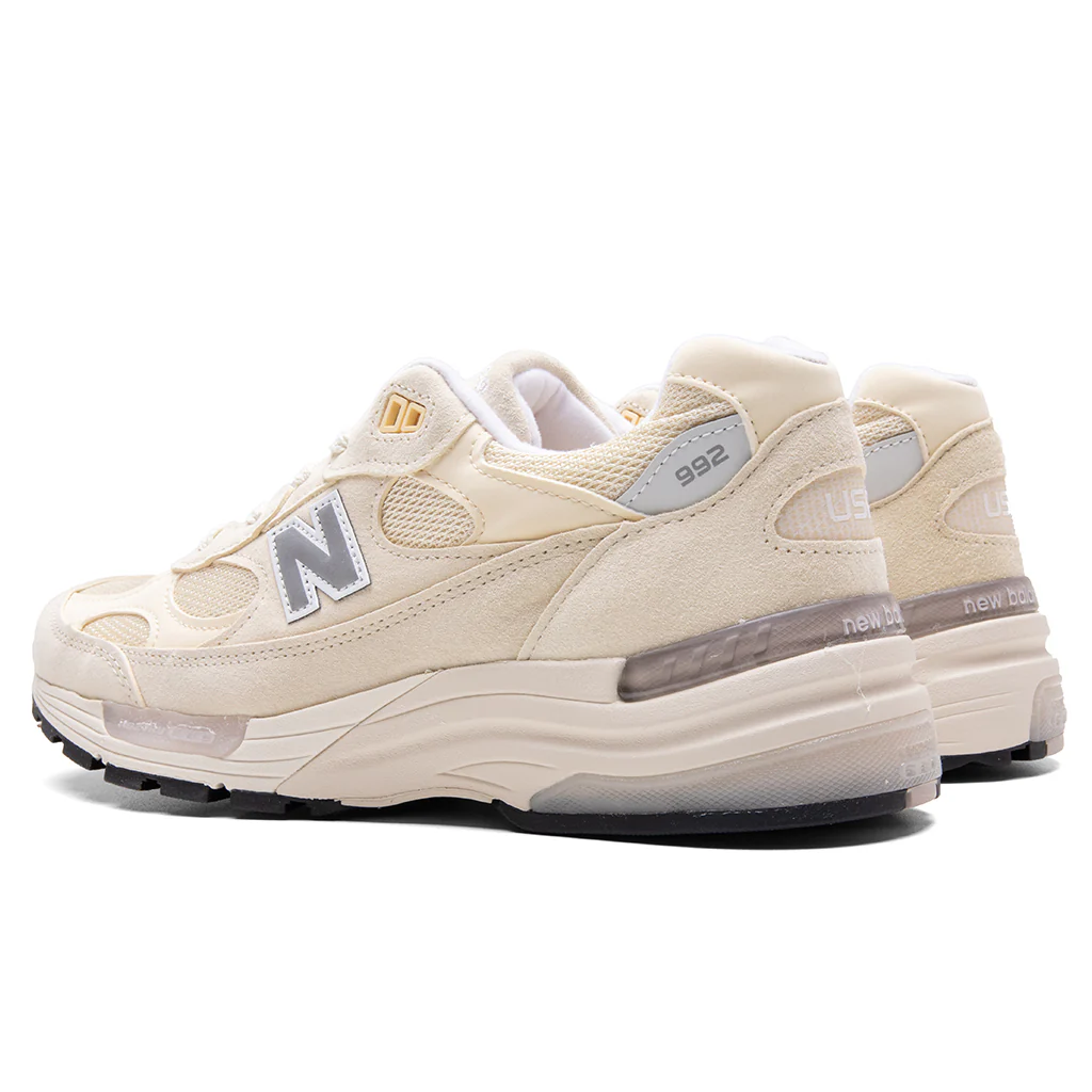 The New Balance Made in USA 992 in a Calcium/Raw Cashew features a suede and mesh upper with leather eye stays. The shoe features a durable rubber outsole and an ABZORB foam midsole for superior cushioning. It also incorporates ACTEVA midsole cushioning support and NDurance rubber outsole technology for enhanced comfort and longevity. The style is completed with a secure lace closure.