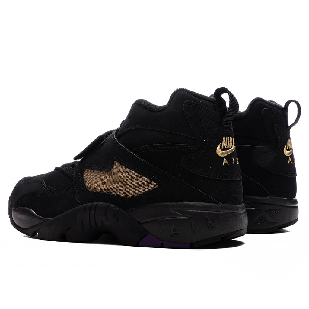 Inspired by Deion Sanders' time with the Baltimore Ravens, the Air Diamond Turf 'Ravens' represents Sanders' legacy and Baltimore's team culture. Featuring a black nubuck upper with mesh gold accents appearing on the mid-foot strap which gives it a distinctive and secure fit. White Swooshes on the mid-foot strap and Nike Air branding adds its signature look, complemented by pull-tabs on the heel for easy on-and-off wear, with a white and purple Diamond Turf logo on the tongue that pays homage to the team's colors. Finished with Max Air cushioning and a durable rubber sole, this silhouette seamlessly combines comfort and standout style.